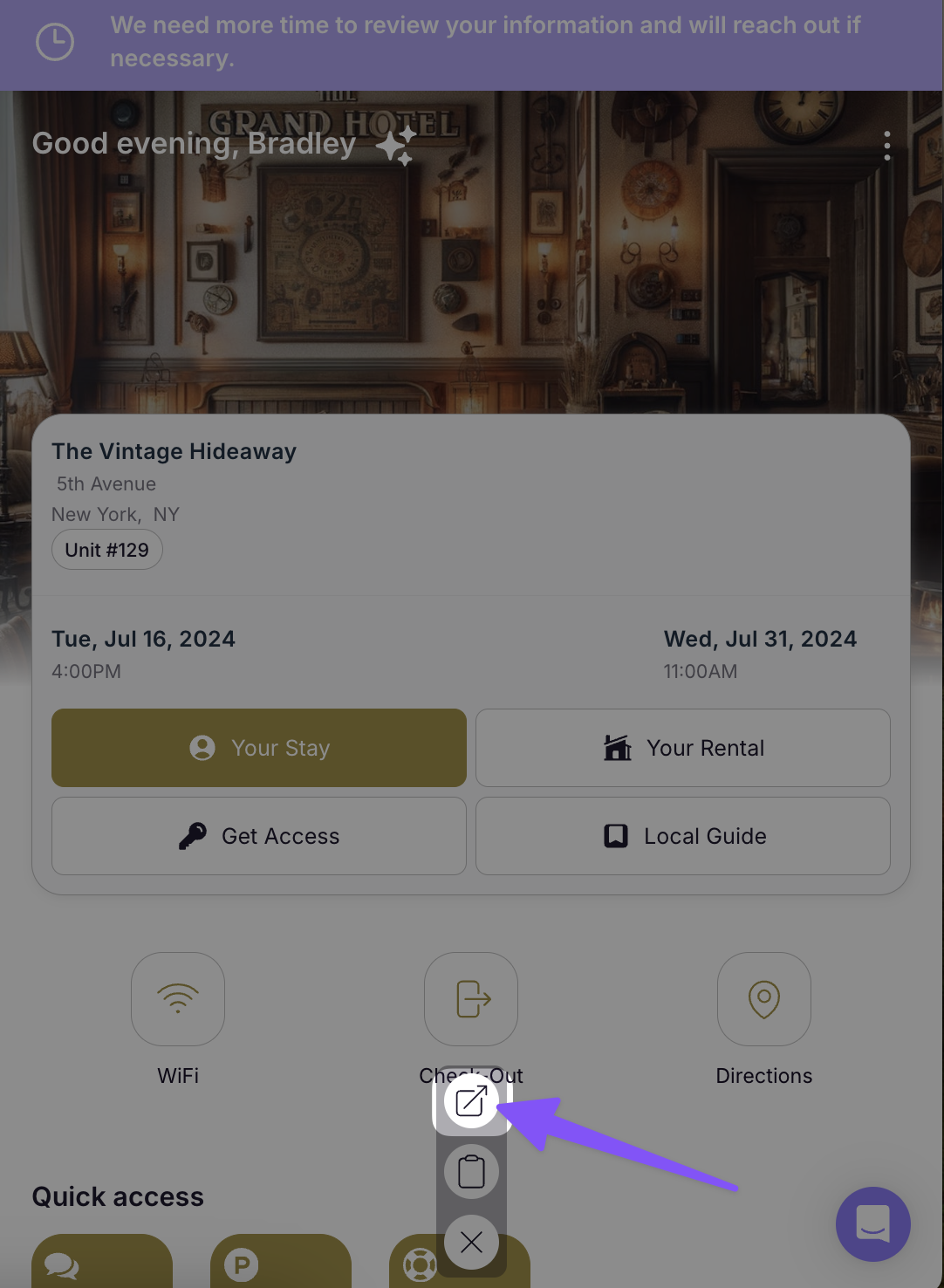 Every guest portal will be specific to a user based on their reservation information and the property they are staying at. This means there is no singular preview portal. To see your guest portal in action you’ll need to view it from a reservation. You can create a test reservation, and then open the guest portal from the reservation details.