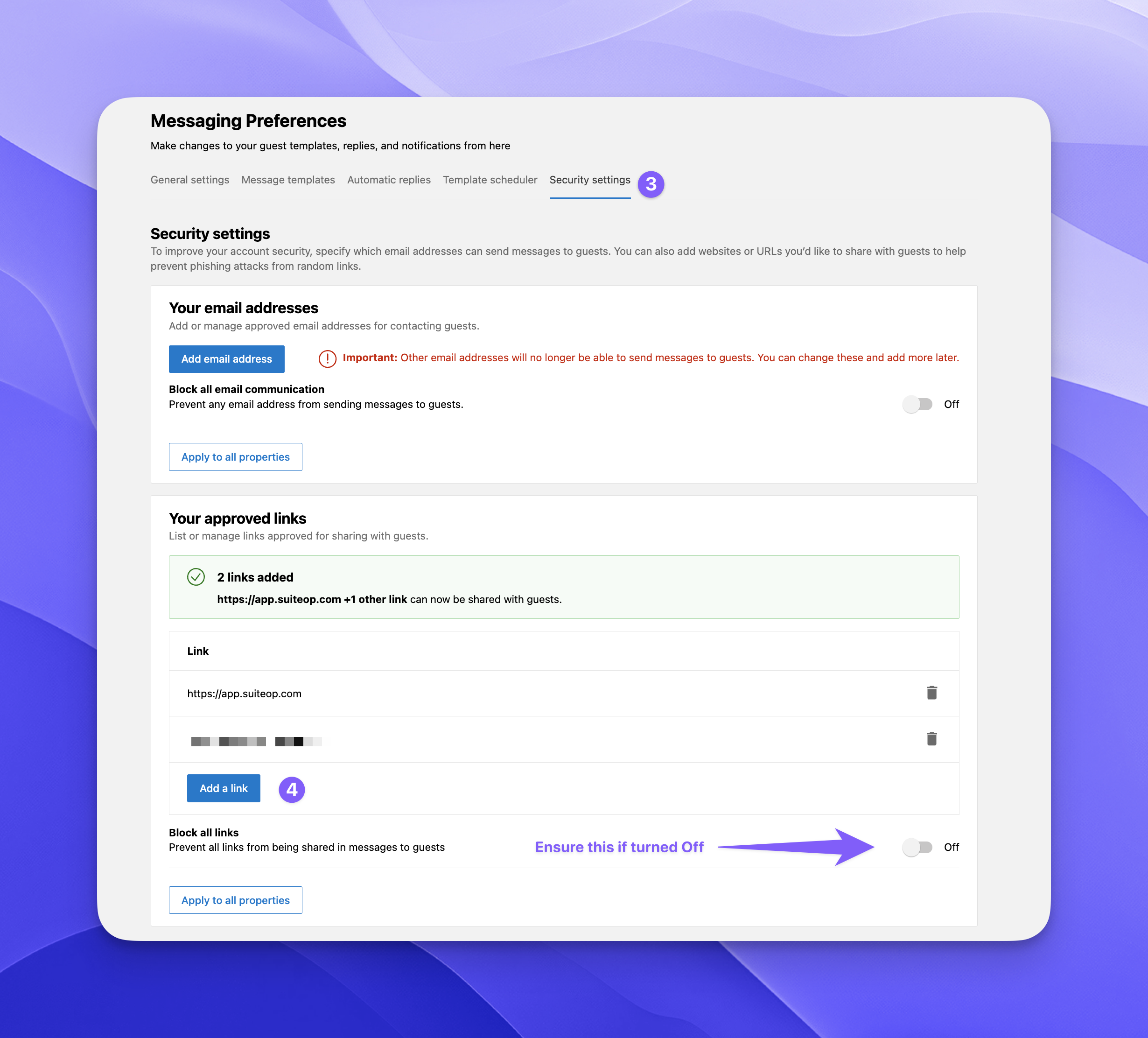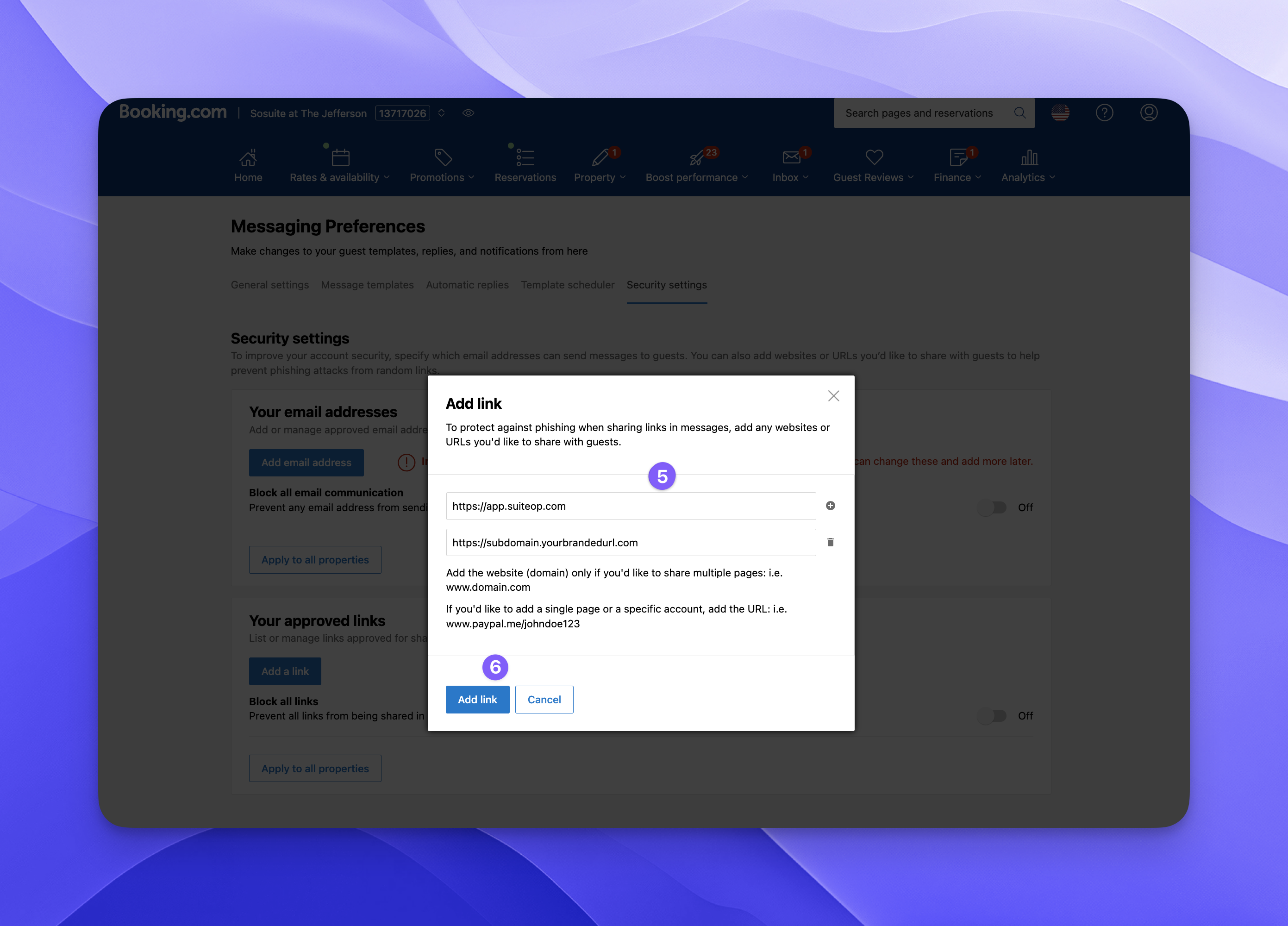 To protect against phishing and spam, we recommend adding your guest portal URLs to Booking.com’s Approved links. This will ensure your guest portal links get delivered securely to each guest. Follow the steps below to add both the generic portal link and your custom URL.