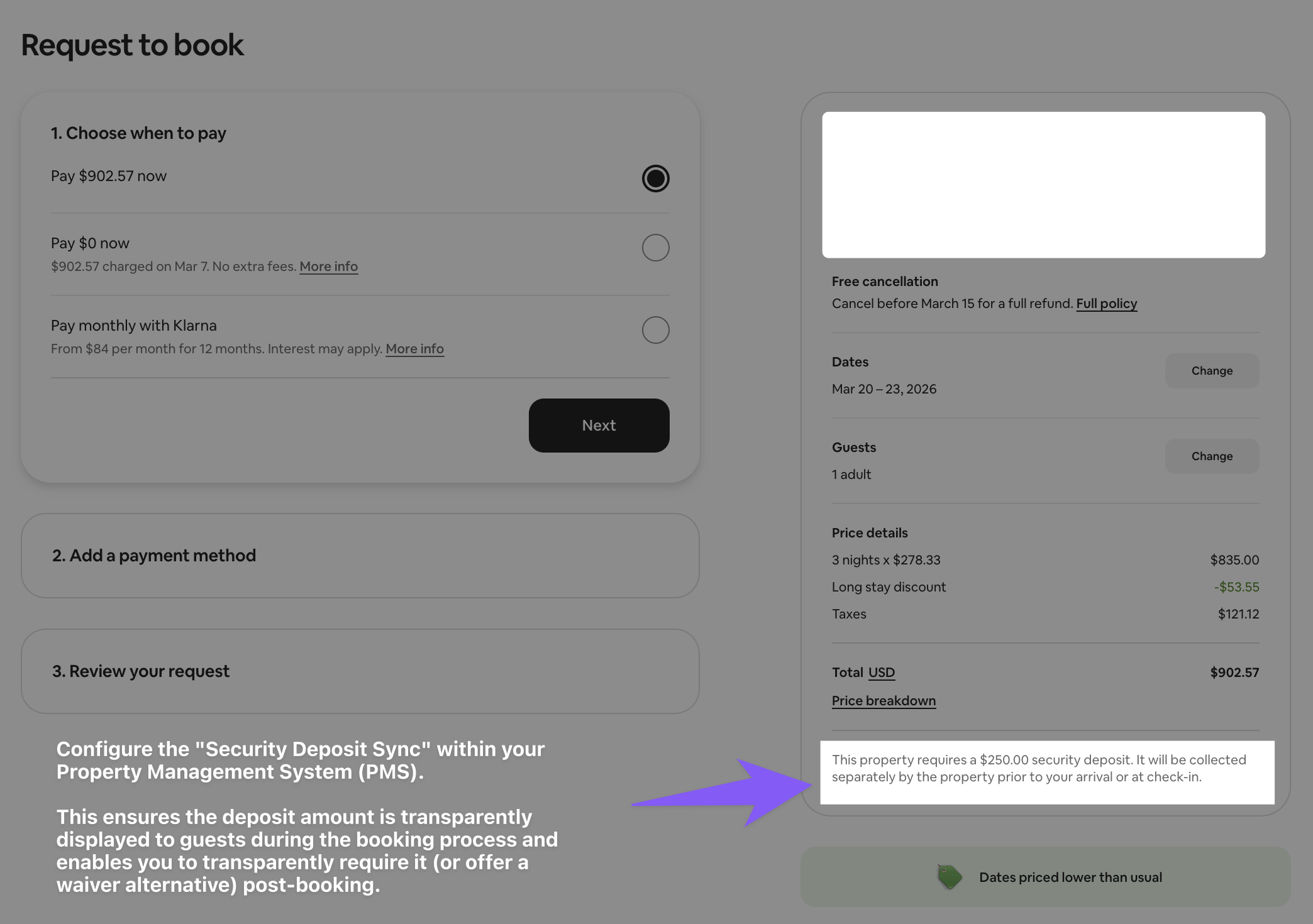 Some Property Management Systems allow you to configure a display to guest within the booking window. This “Security Deposit Sync” is shown below on Airbnb.