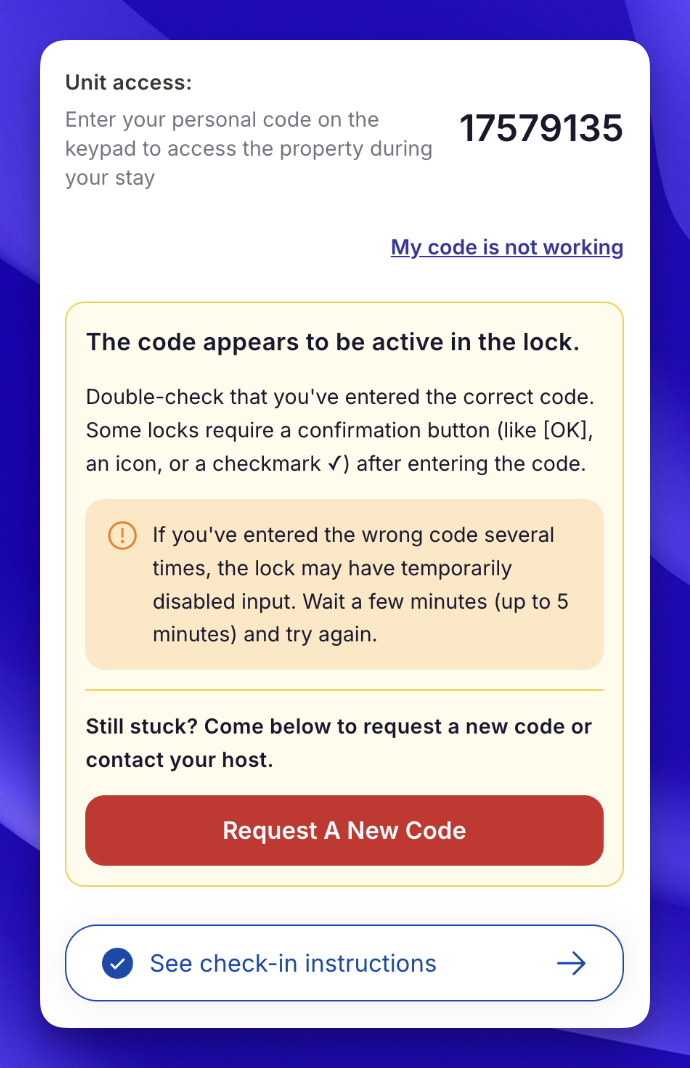Guest-initiated replacement - Guests can click “My code is not working” in their portal (after check-in time) to swap to a backup code themselves