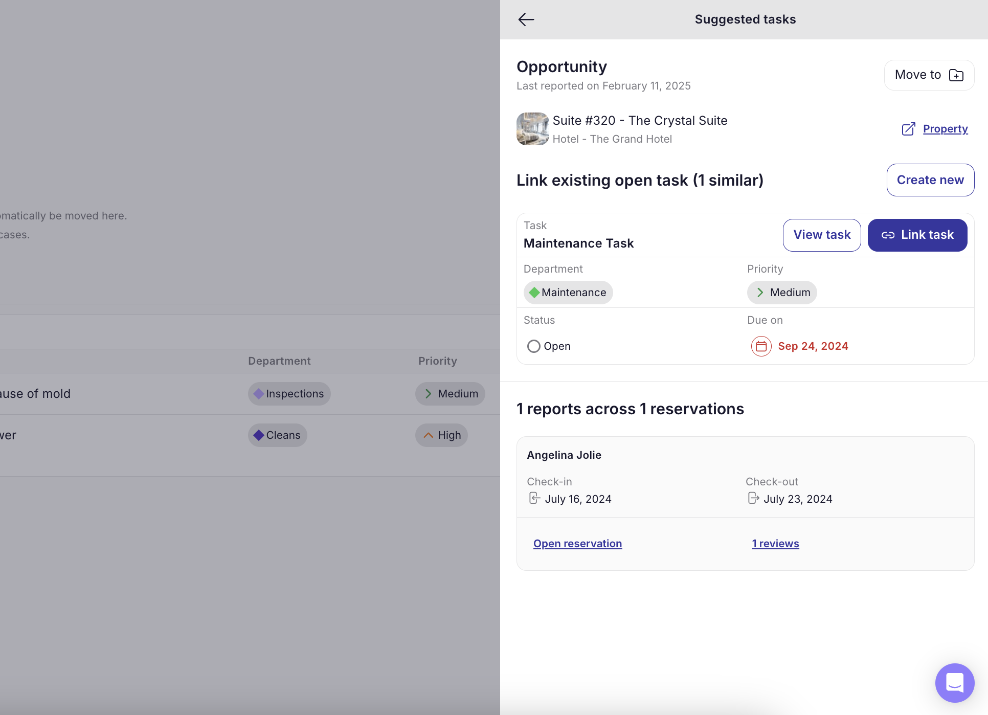 Task suggestion After finding a potential issue, SuiteOp will suggest a task for you to create to solve the guest’s problem.If a similar issue already exists, you can link that issue or Create new. This can be anything from fixing a broken lamp to addressing cleaning problems.
