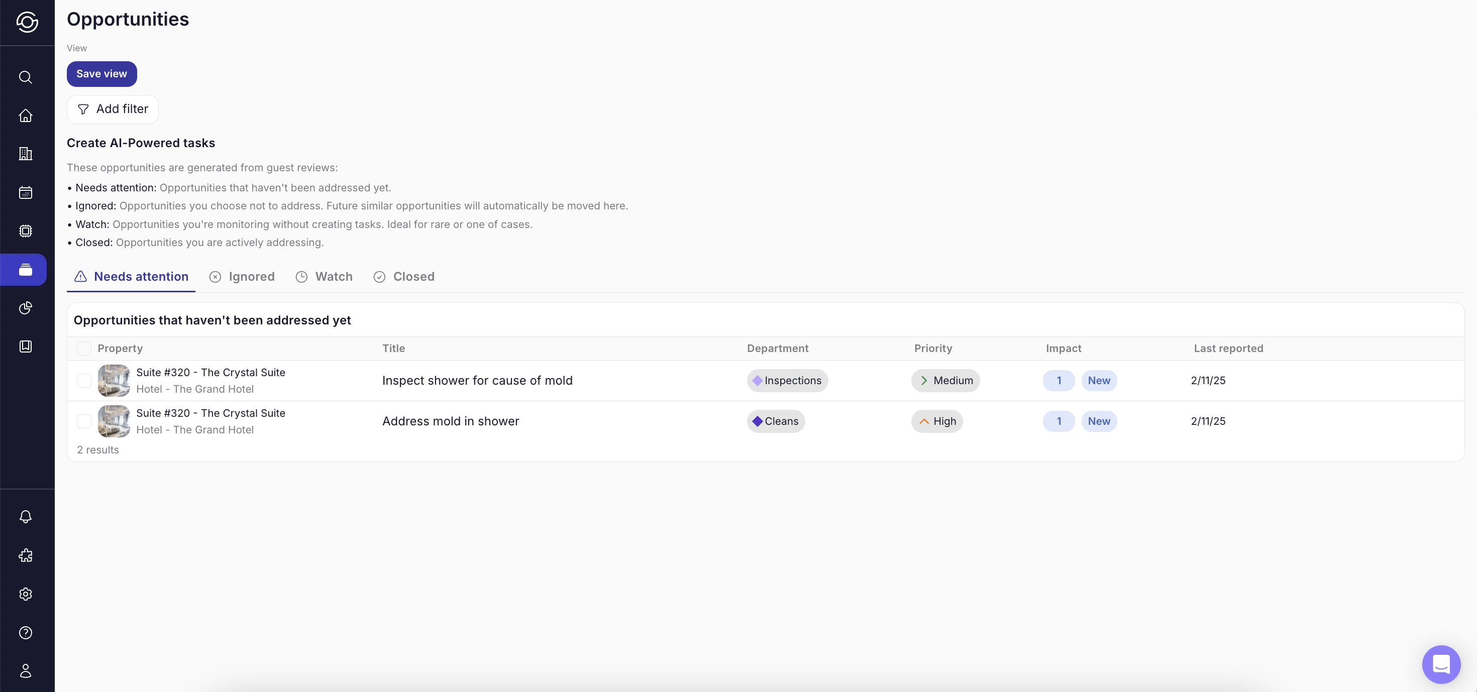 Guests leave a ton of valuable feedback in their SuiteOp surveys and public reviews. It can be hard to keep track of which properties have which issues and when something becomes a real problem you should fix. Our AI will read through every guest survey and review and suggest tasks for your team, with a department, urgency, title, and description connected to the relevant property. Learn more about how it works below.