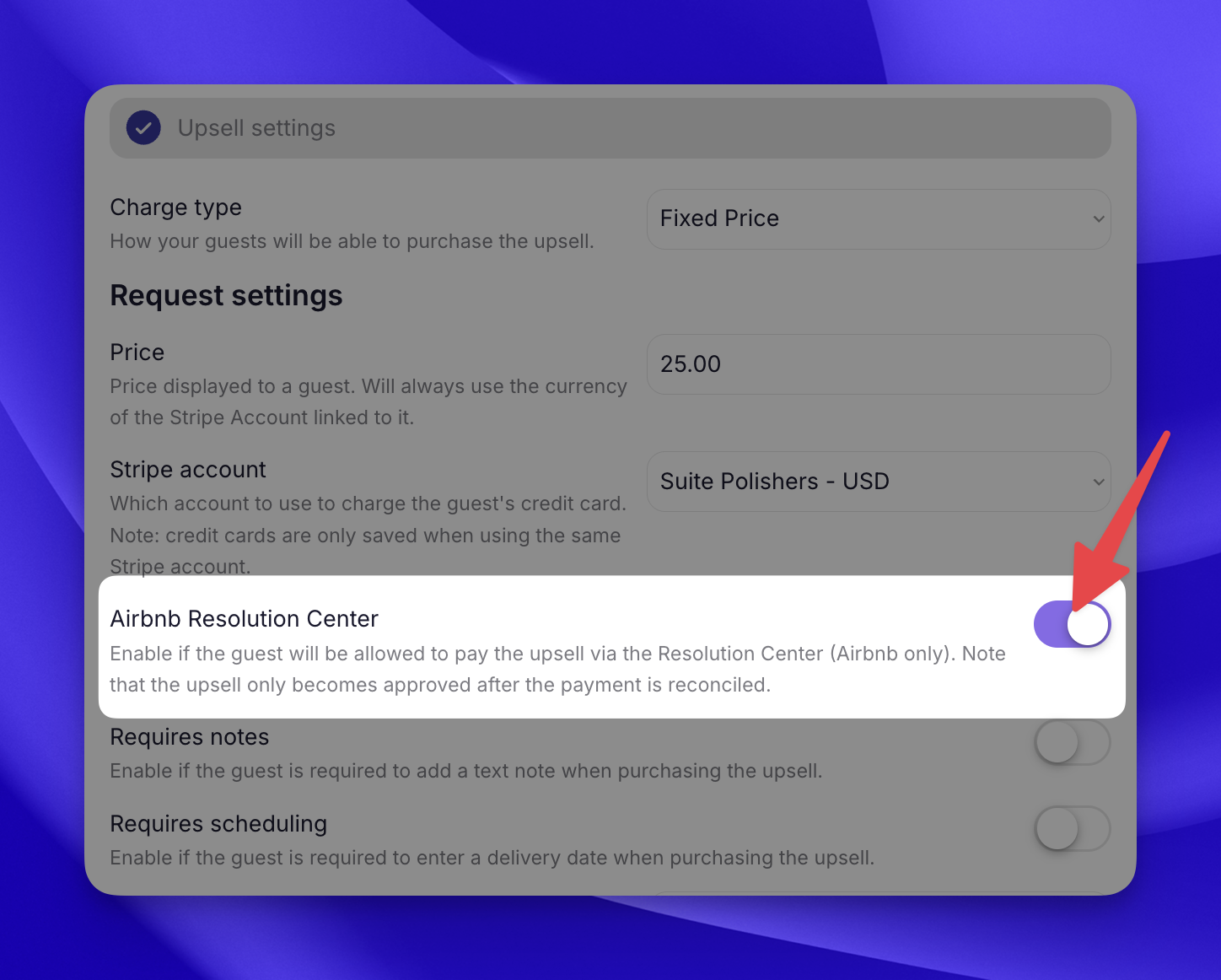 If enabled, when an Airbnb guest requests or purchases an upsell with a price, they will be given the option to pay by credit card or through the Airbnb Resolution Center.